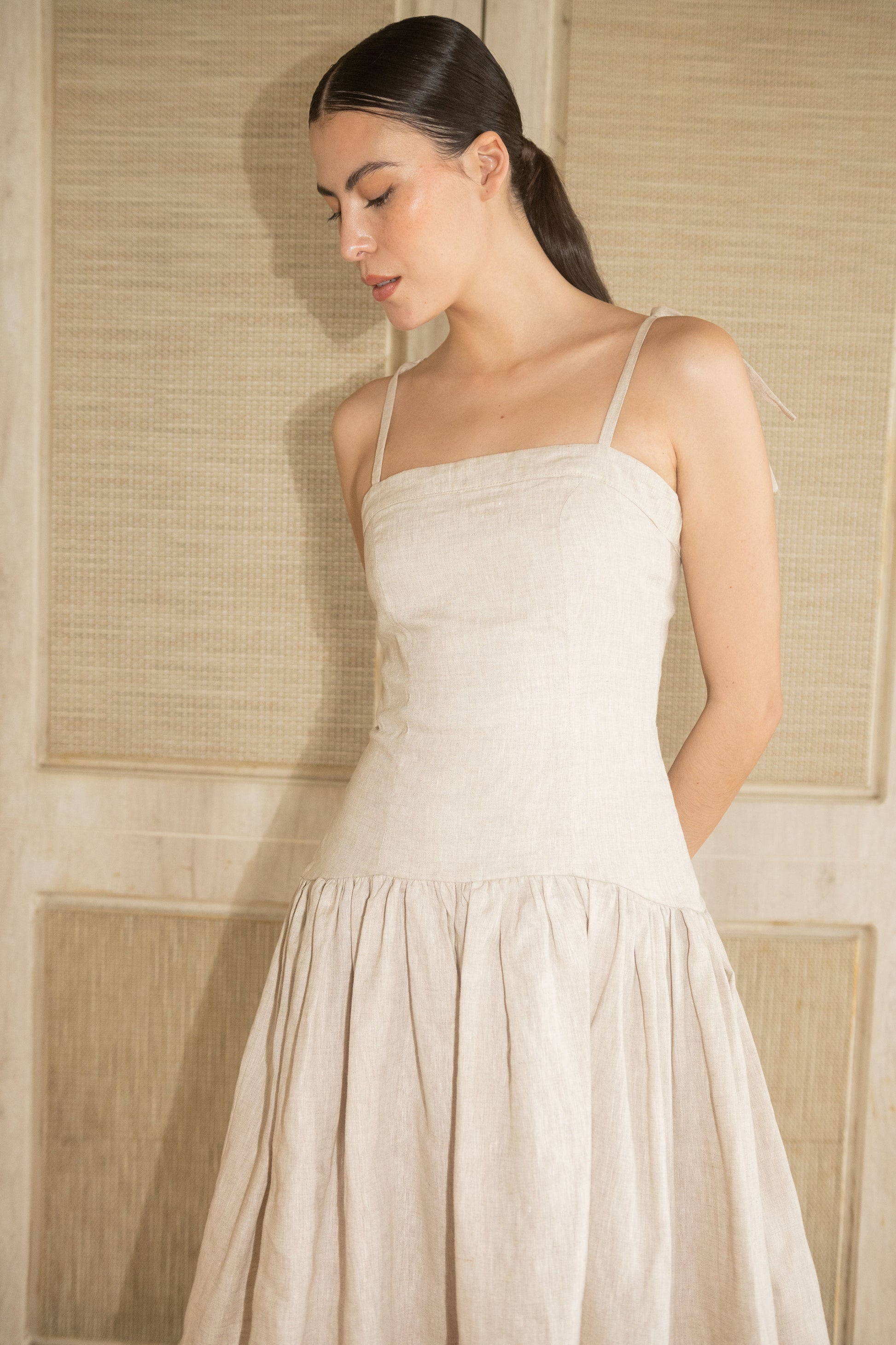 ¡Consigue un look fresco y divertido con nuestro Vestido! Con un escote recto y tirantes ajustables en forma de lazo, este vestido de lino será tu aliado en las tardes de verano. Además, su corte en cadera y falda fruncida le darán un toque coqueto y femenino. ¡Disfruta de la comodidad y estilo con este vestido!