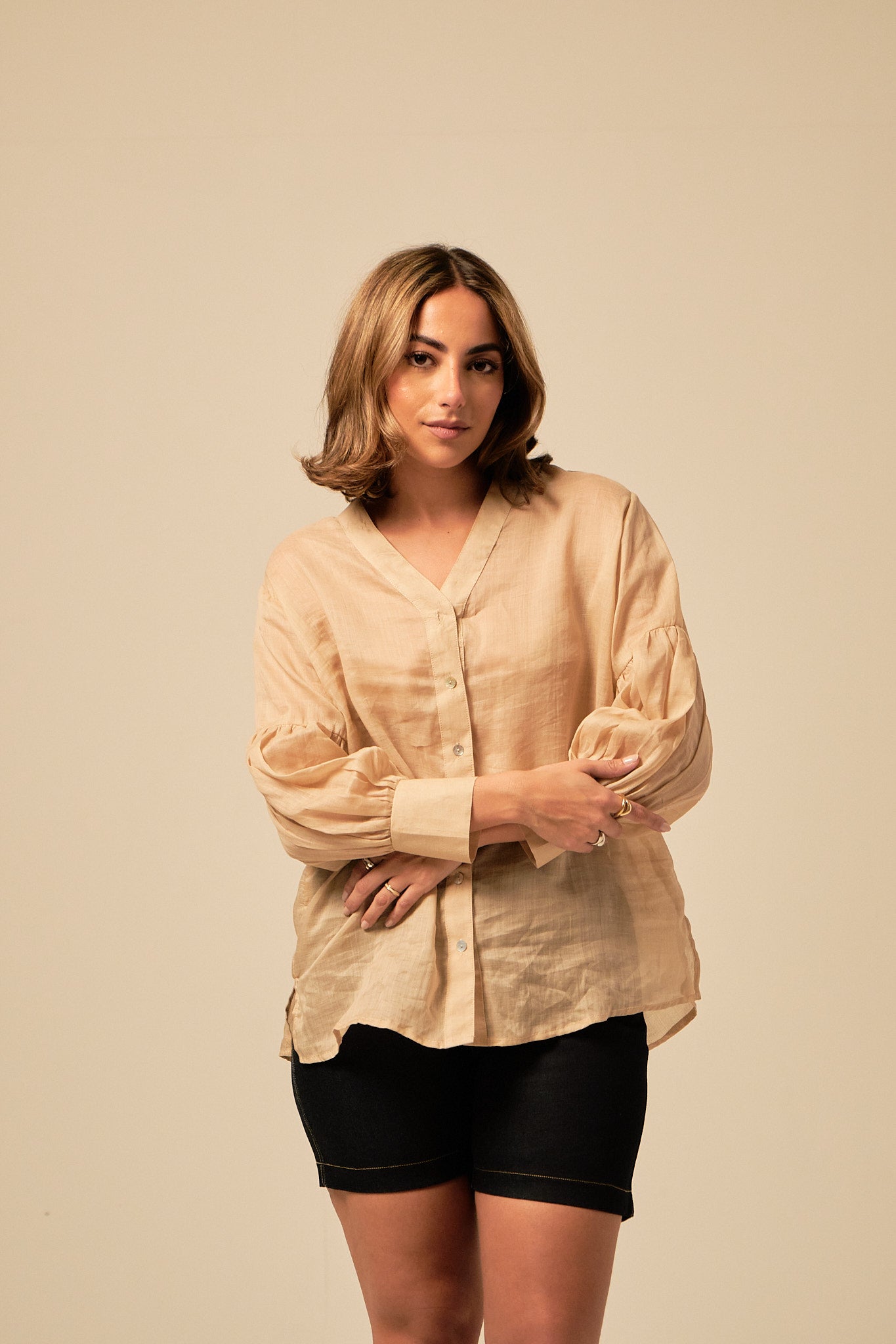 Vínnitsa es un blusón en olán 100% suave y delicado, silueta amplia, manga abombada, puño ajustable con botones. La puedes usar para un look más formal en tu trabajo o para un look de noche con accesorios de tu preferencia.